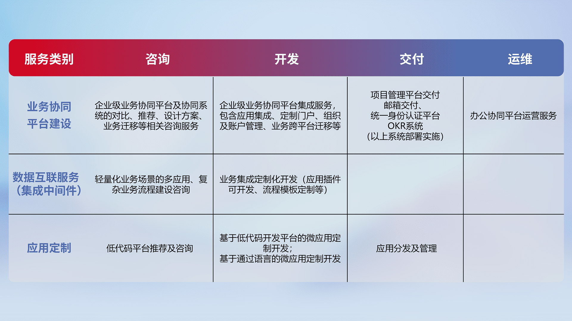 针对钉钉、、企微、、、IDaas等平台级产品提供产品的规划、、方案、、、、交付、、、、定制化开发等服务,,,,实现如统一协同办公、、智能客户服务、、混合会议管理、、、、智能数据查询、、、、等业务场景,,,实现数字化转型。。。。